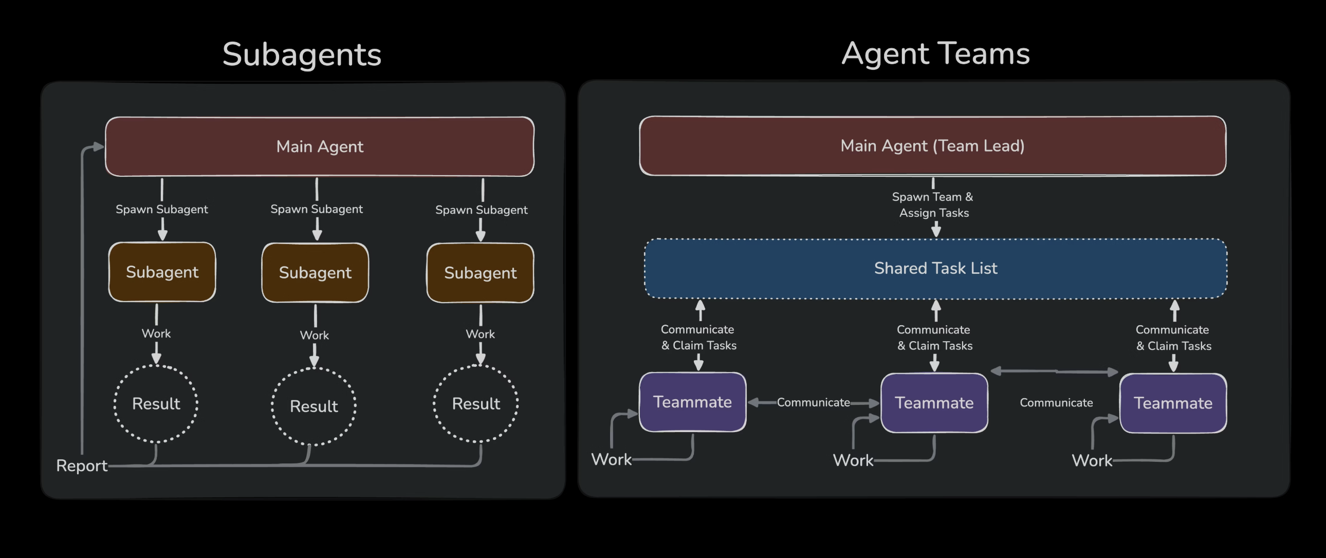 | 커뮤니케이션 | 메인 에이전트에게만 결과 보고 | 팀원끼리 직접 메시지 교환 가능 |