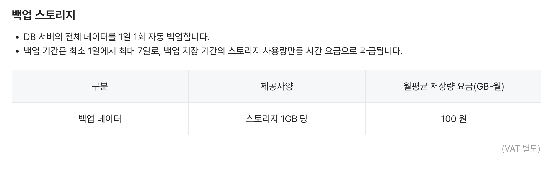 매일 자동 백업이 진행되며, 최소 1일 ~ 최대 7일까지 백업 데이터를 보관할 수 있습니다. 백업 저장 기간 동안의 스토리지 사용량에 대해 GB당 시간 요금이 부과됩니다.