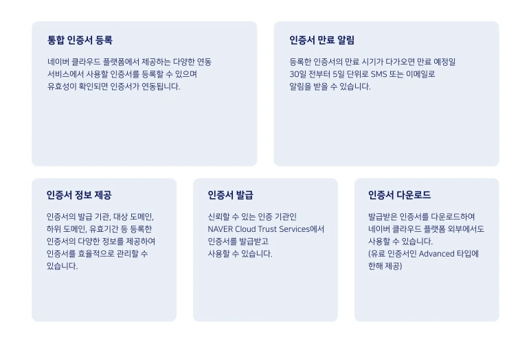 Certificate Manager는 네이버클라우드플랫폼에서 SSL 인증서를 손쉽게 등록 · 발급 · 관리할 수 있는 서비스입니다.