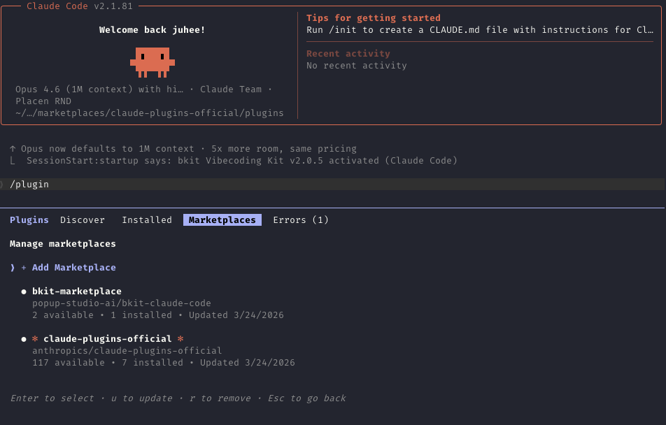 # 1. bkit 마켓플레이스 추가