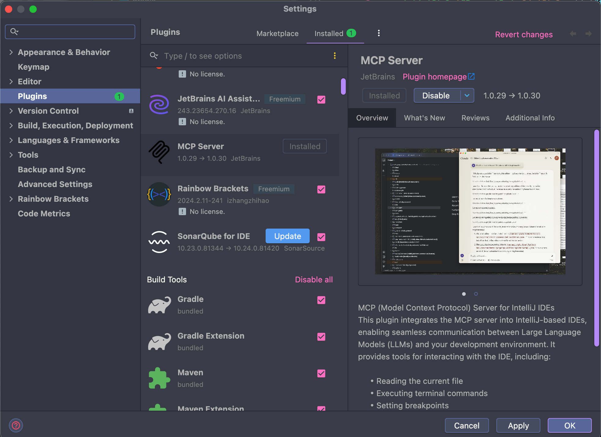 - JetBrains에서 공식 제공하는 "MCP Server" 플러그인 찾기